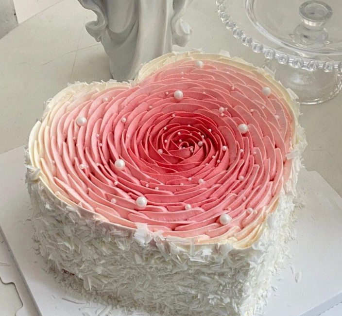 A classic centerpiece: a tender vanilla or red velvet cake shaped like a heart, covered in silky pink buttercream, adorned with fresh roses and edible pearls. Soft, elegant, and impossibly romantic.